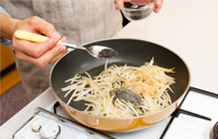 熱したフライパンに、STEP.1で用意したもやしとごま油を入れ、フタをして強火で蒸し焼きにする。