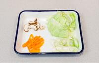 長ネギは8mm厚の斜め切りに、にんじんは短冊切り、キャベツは5cm角に切る。しいたけは石づきを切り、軸と傘は薄切りにする。